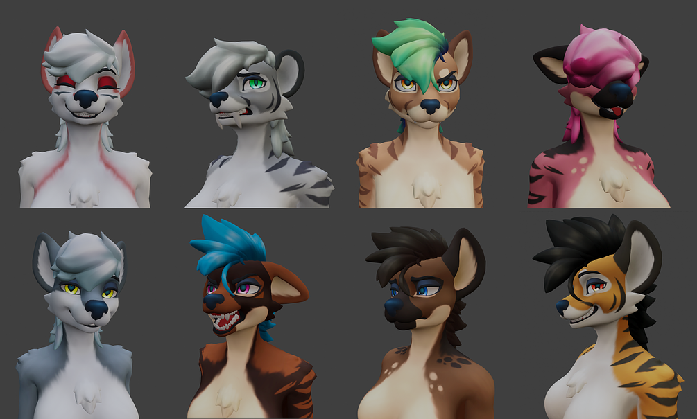 The Hyenid Model (Blend, FBX), Textures (PNG, PSD, SPP) and a preconfigured unity package for VRChat. 72k Polys with all accessories, below 70k Polys for the quest version.